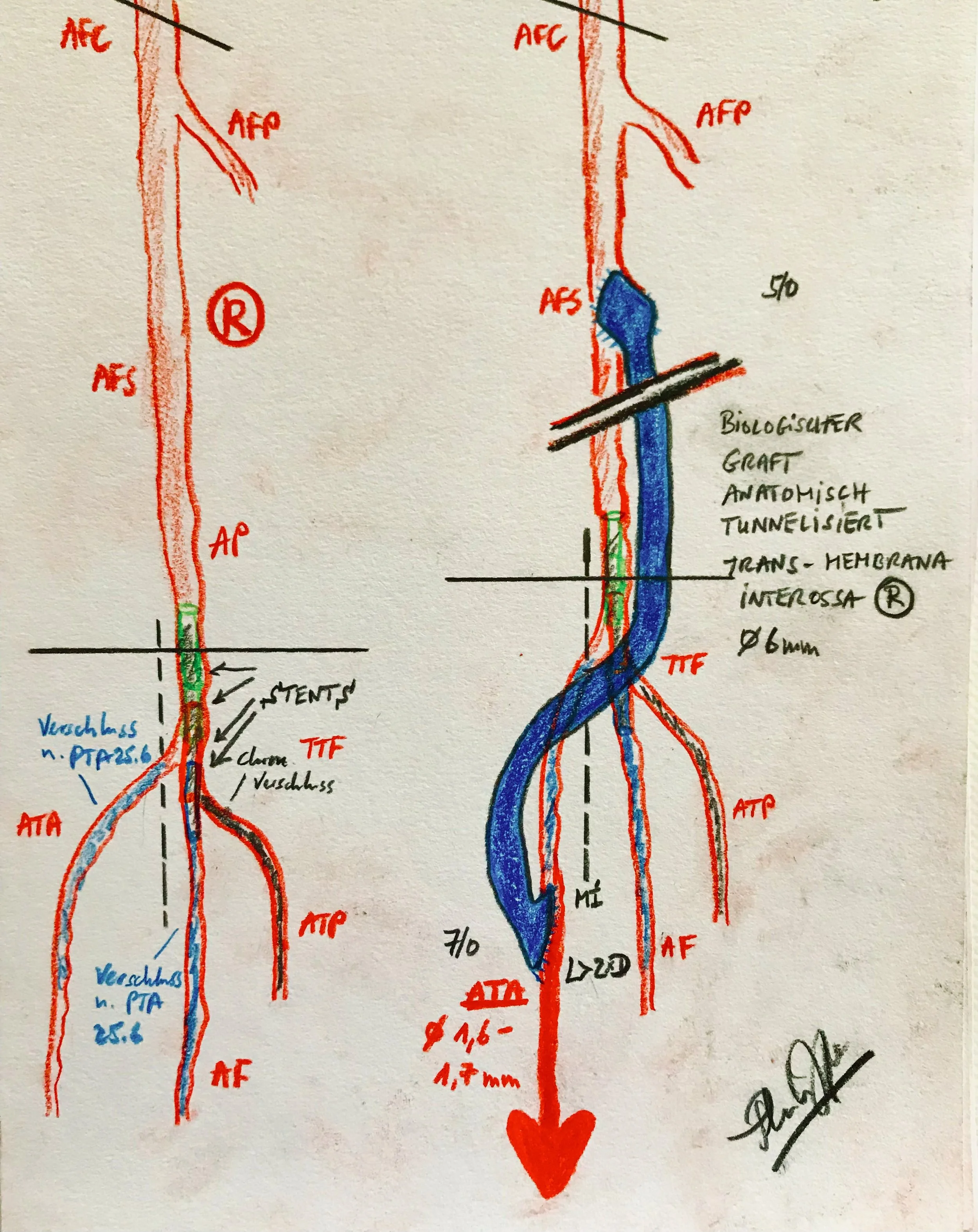 Bei chronisch kritischer Ischämie am Bein, wenn alle endovaskulären Optionen ausgeschöpft wurden, gibt es noch die Möglichkeit einer Revaskularisation die langlebig sein kann: ein anatomisch angelegter Bypass. Aus meiner Zeit als Consultant vascular surgeon am Guy’s and St Thomas’ Hospital in London in 2013 hatte ich das Privileg diese zu erlernen und anzuwenden. (Credits Prof. Hany Zayed, vascular surgery department, GSTT, London).